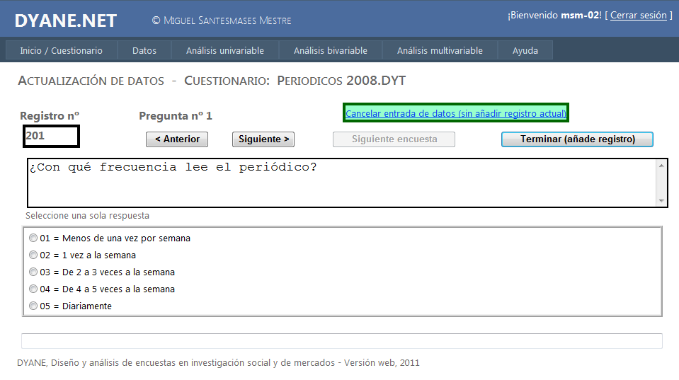 La primera vez que se utiliza el programa es necesario entrar un archivo de datos (extensión 'dyt') desde el disco duro o memoria externa del ordenador. Este archivo, así como cualquier otro que se cargue posteriormente, quedará guardado automáticamente en el servidor, por lo que en las siguientes ocasiones en las que se utilice el programa podrá abrirse el archivo desde el servidor, sin necesidad de volverlo a cargar desde el ordenador local o disco externo. Una vez abierto el archivo, se mostrará el contenido del cuestionario.